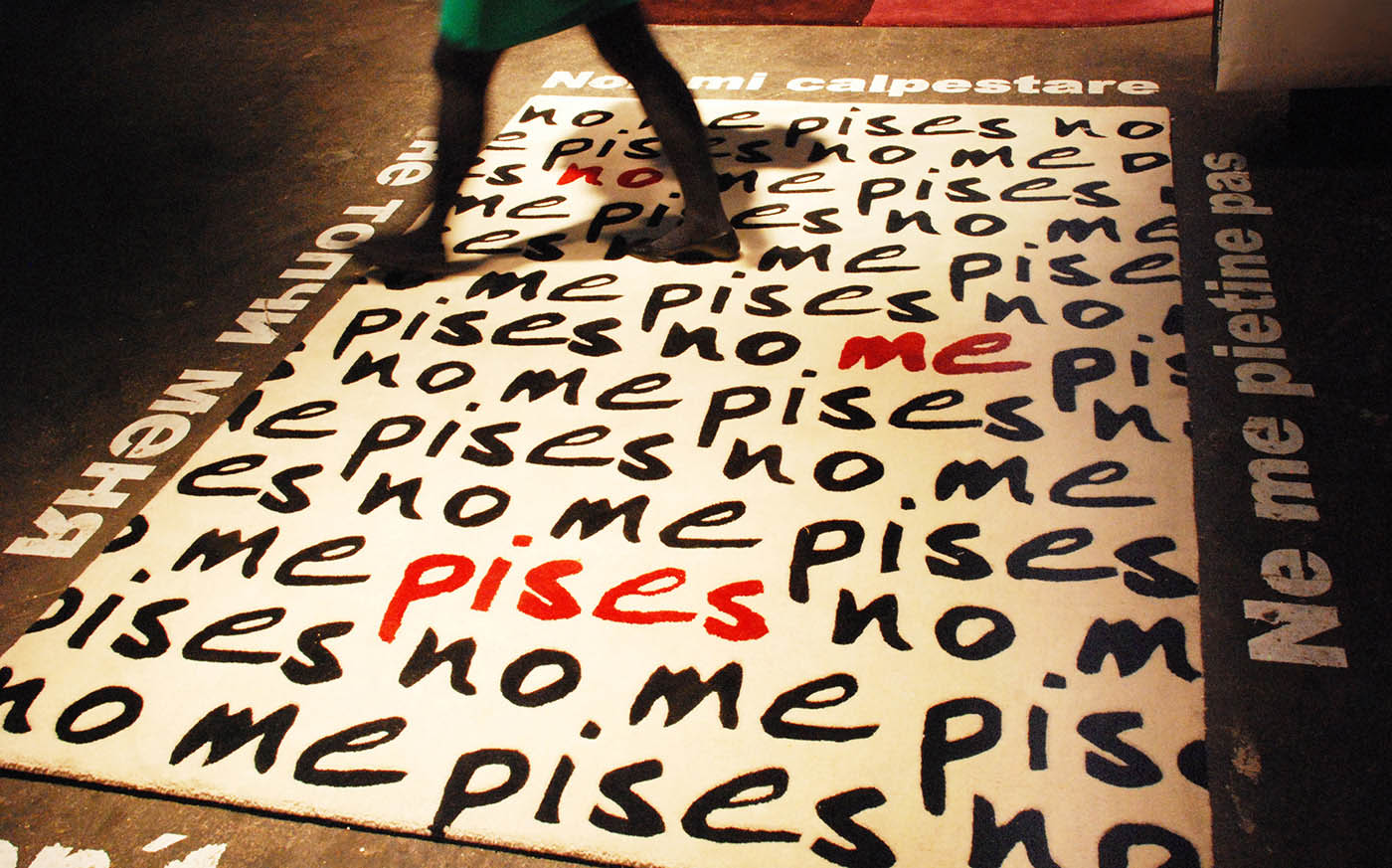 No me pises es una alfombra que protesta de su propia condición de alfombra, que se ha cansado de ser pisoteada y reclama tener su espacio. Esta alfombra rebelde se ganó la simpatía del público que la compró en grandes cantidades y llegó a ser copiada hasta en unas zapatillas de andar por casa.