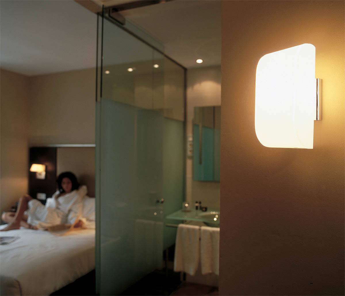 La lámpara Inside que hemos diseñado para Vibia está formada por dos largas láminas de cristal opal. Estas dos piezas están curvadas y encajan entre sí, dejando la fuente de luz en su interior.