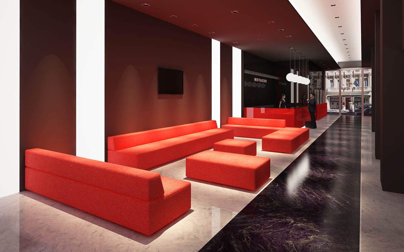 The building has not any relevant architecture. So the interior design had to be impressive to achieve an adequate global result. For this reason, in the common areas the red, white and black colors are combined with the geometric shapes inside so as to give them greater visual power.