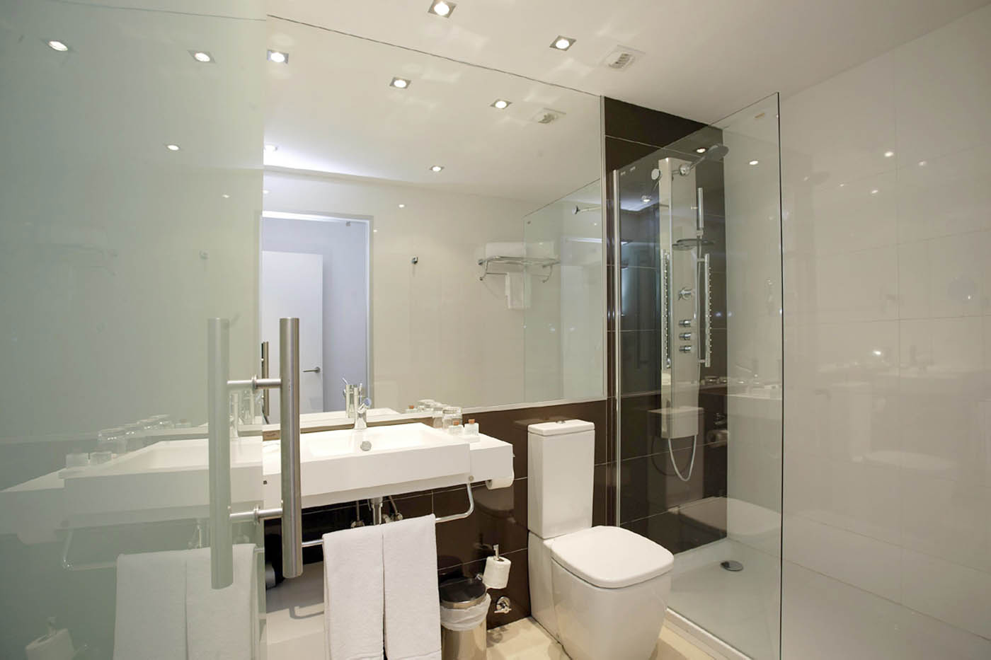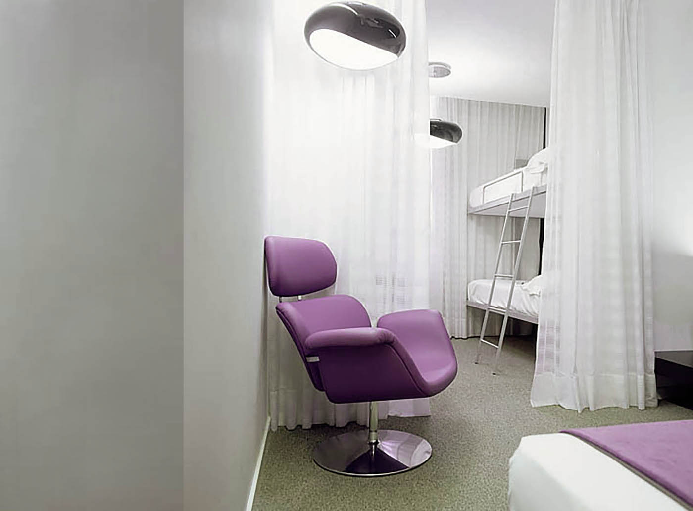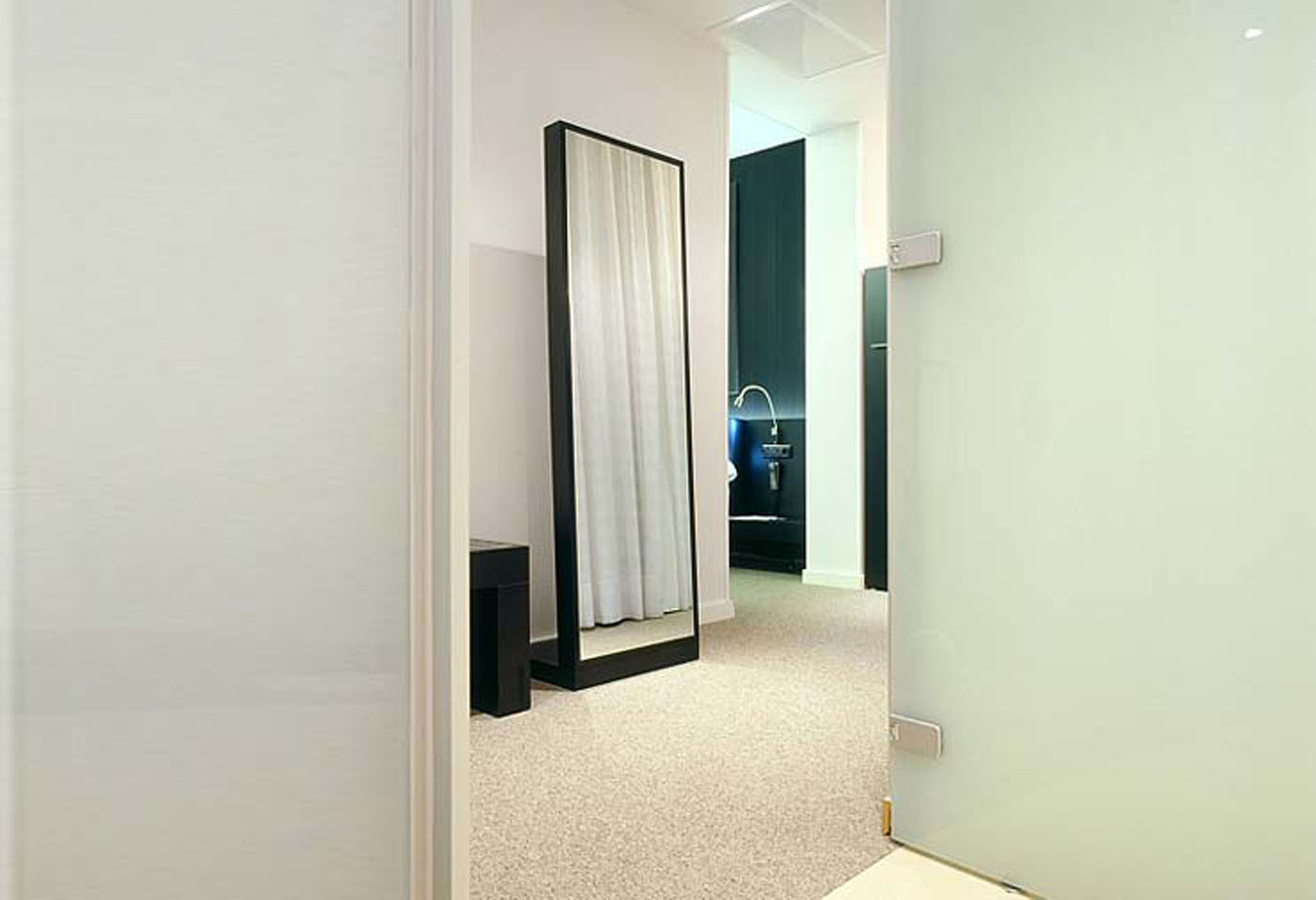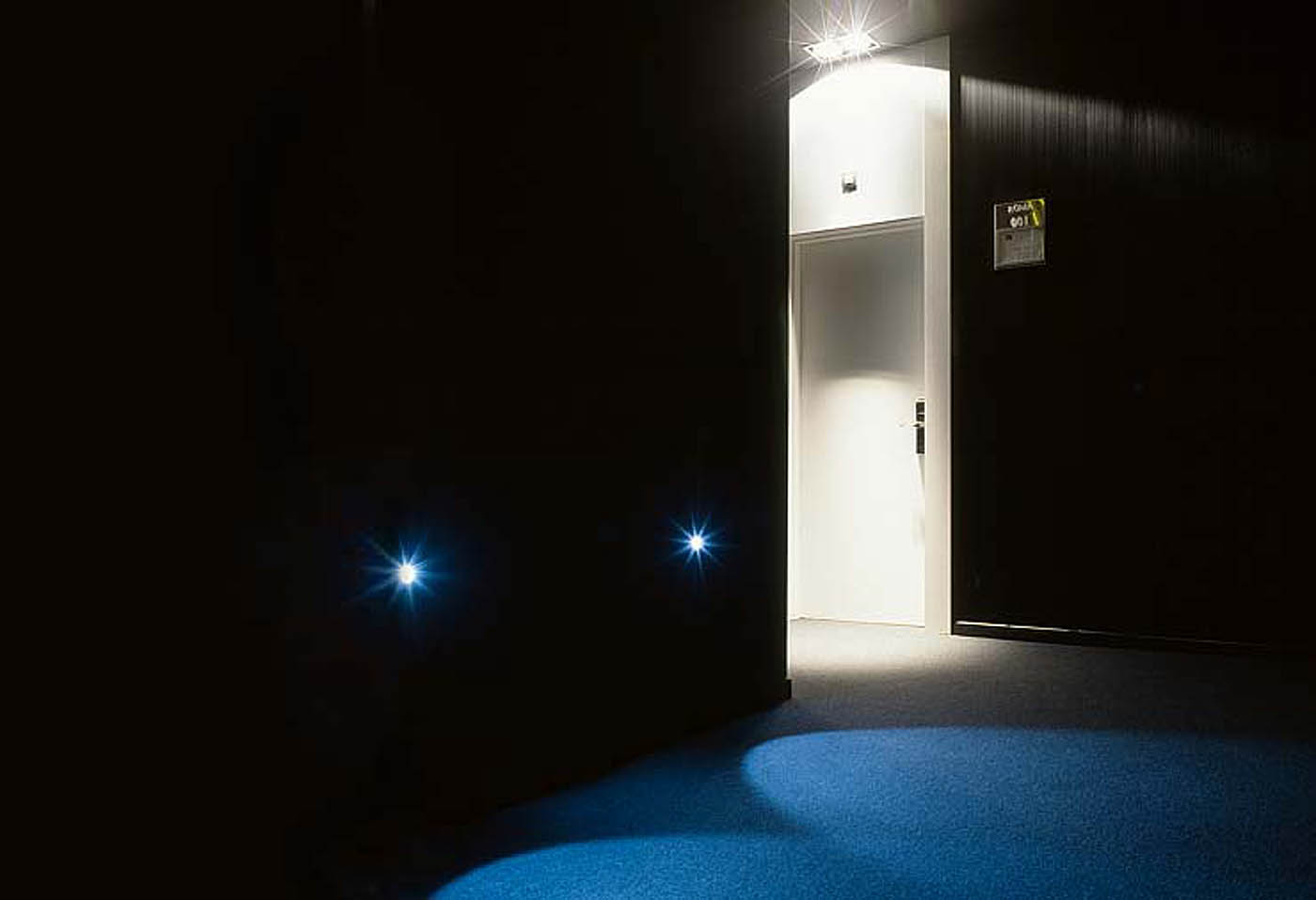 Once we advance to the private part of the hotel we find the access corridors to the rooms. We have looked for a mysterious and silent design, where the white doors that float inside the darkness stand out.
