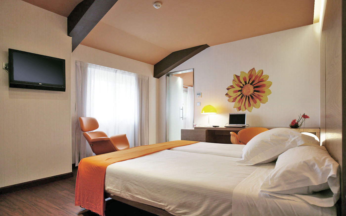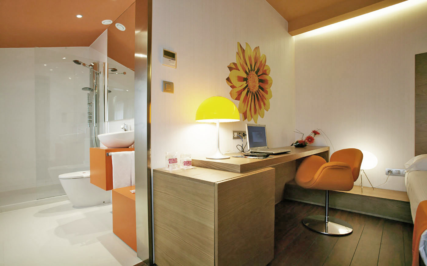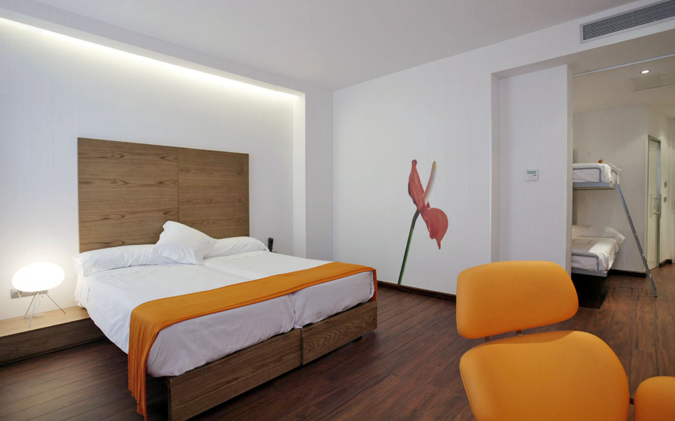 El hotel cuenta con 65 habitaciones en las que quisimos enfatizar la luz y la alegría de la ciudad empleando el color naranja en numerosos detalles.