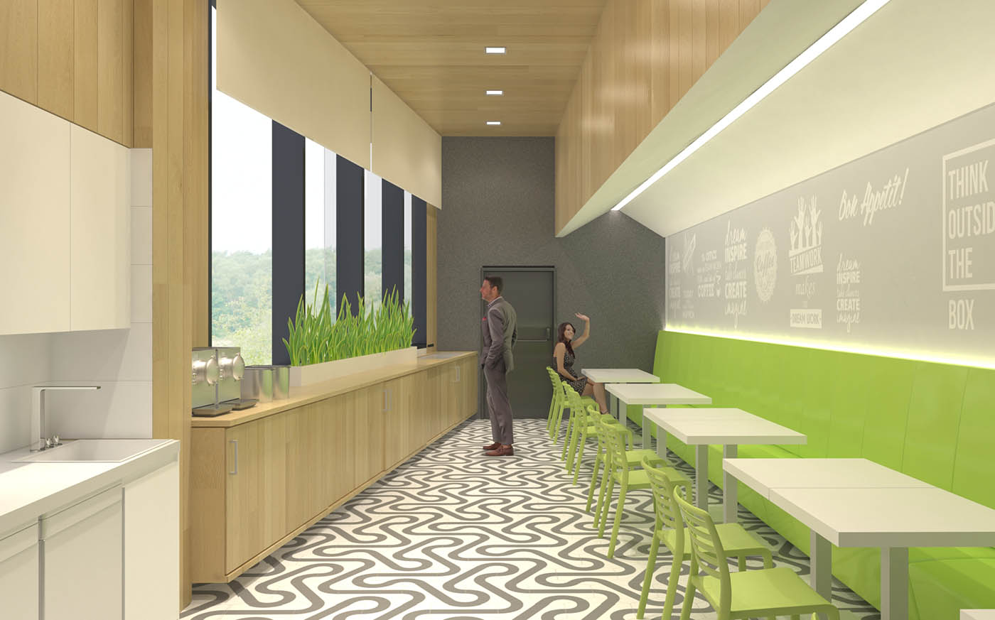 La oficina cuenta con seis salas de reuniones de distintos tamaños y para diferentes usos. También tiene un espacio destinado al descanso donde los trabajadores pueden comer o reunirse con sus compañeros de manera informal.