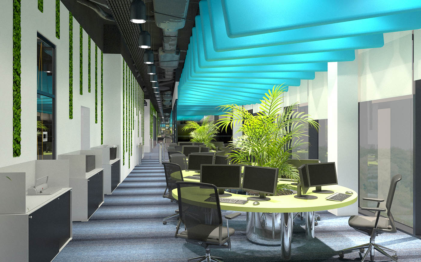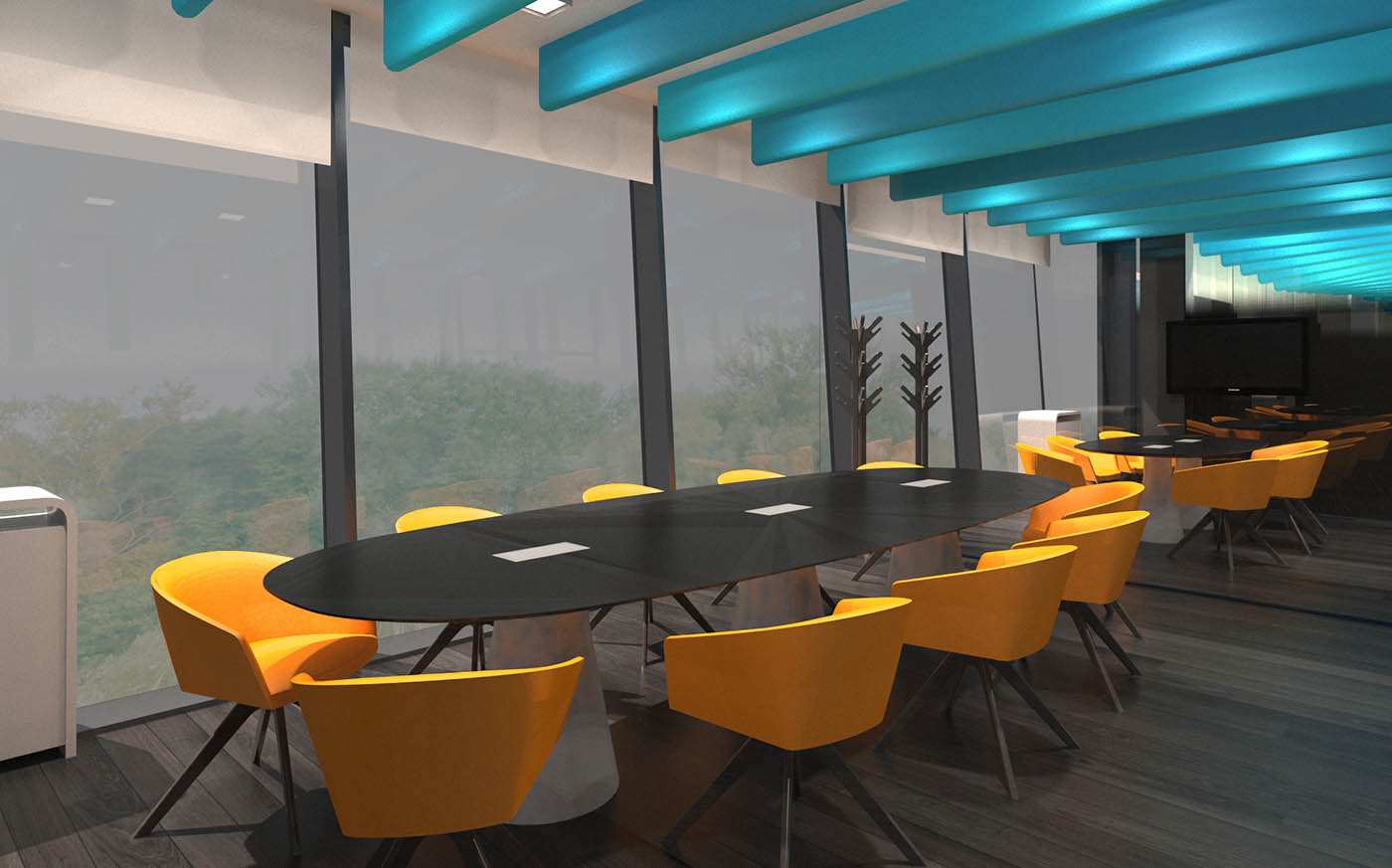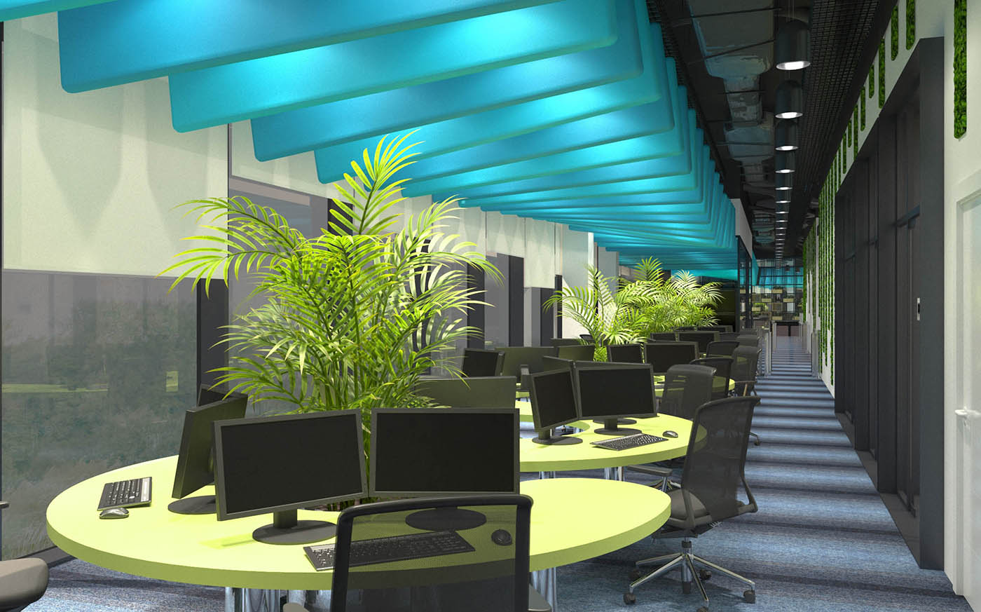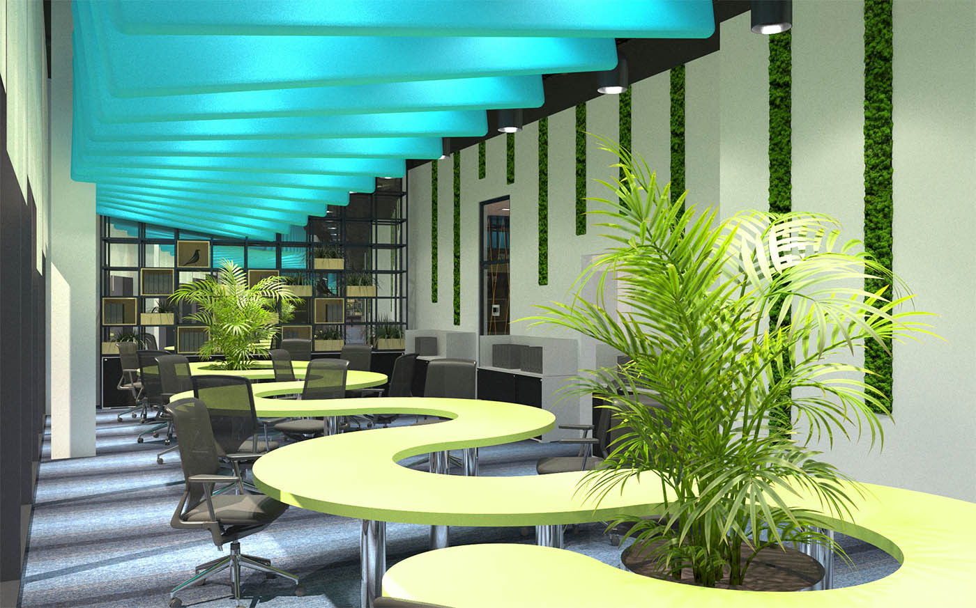 Los 30 puestos de trabajo de los diferentes departamentos se distribuyen a lo largo de tres grandes mesas sinuosas. Estas mesas marcan el carácter lúdico de la oficina y permiten tener flexibilidad para crecer en número de empleados si fuera necesario. Sobre ellas, los paneles acústicos marcan un ritmo dinámico simulando un cielo en movimiento.