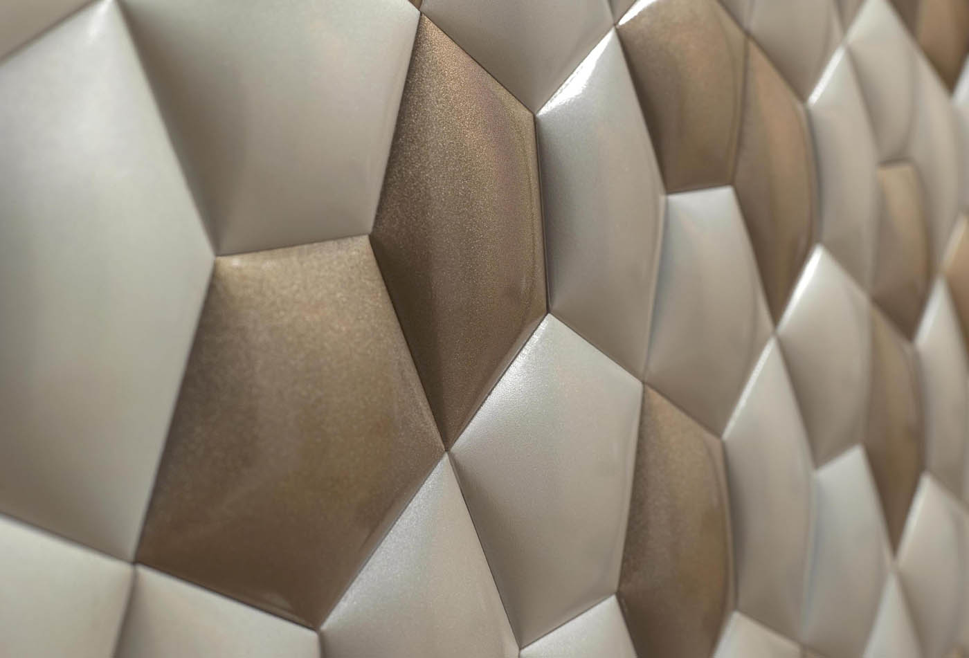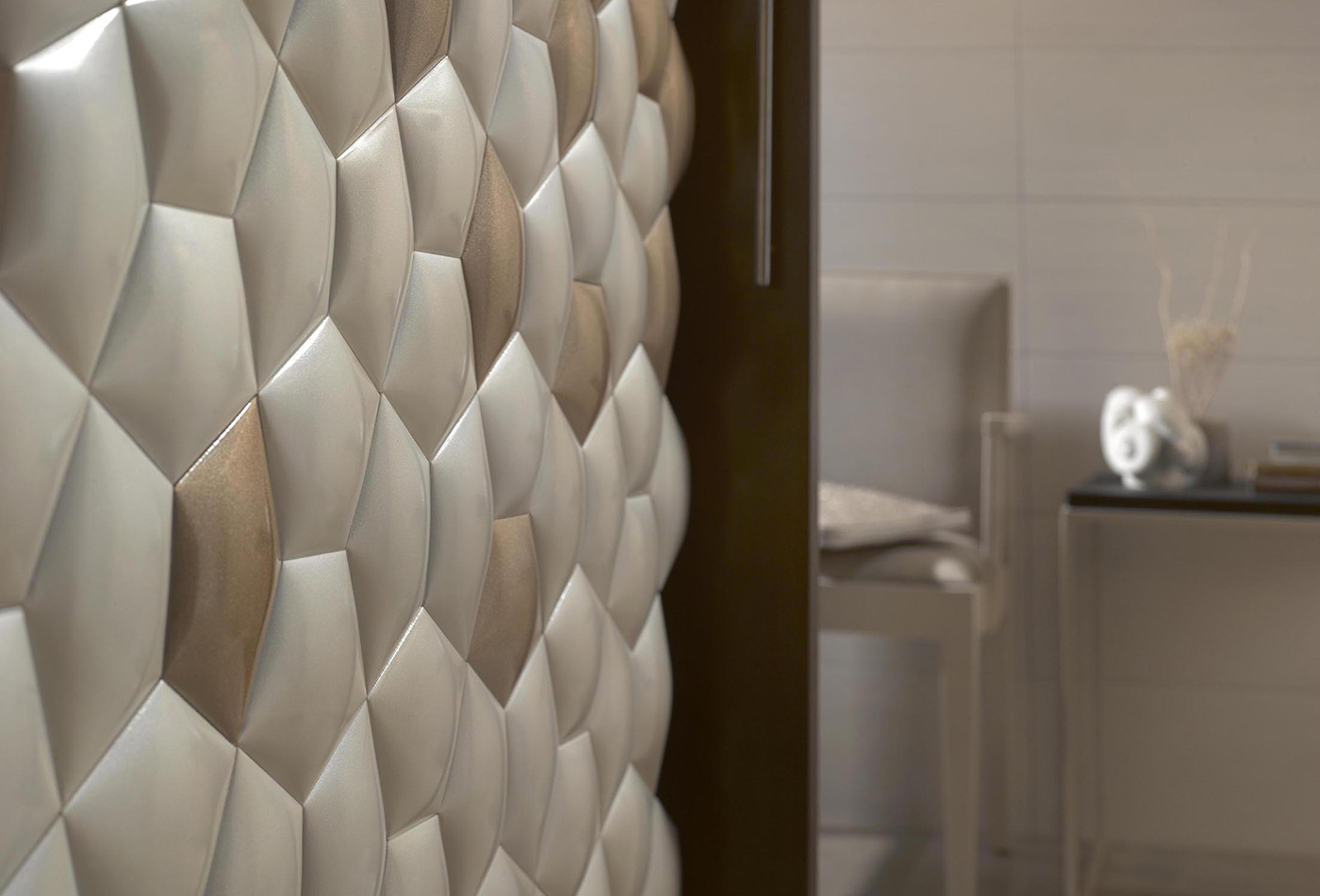Through its relief, the different pieces energize the reflection of ceramics, creating sinuous shapes that change due to the motion and incidence of light. It is the only randomness in the constructive accuracy of nature that KIN represents, and what nevertheless gives its spontaneous sparkles of beaut
