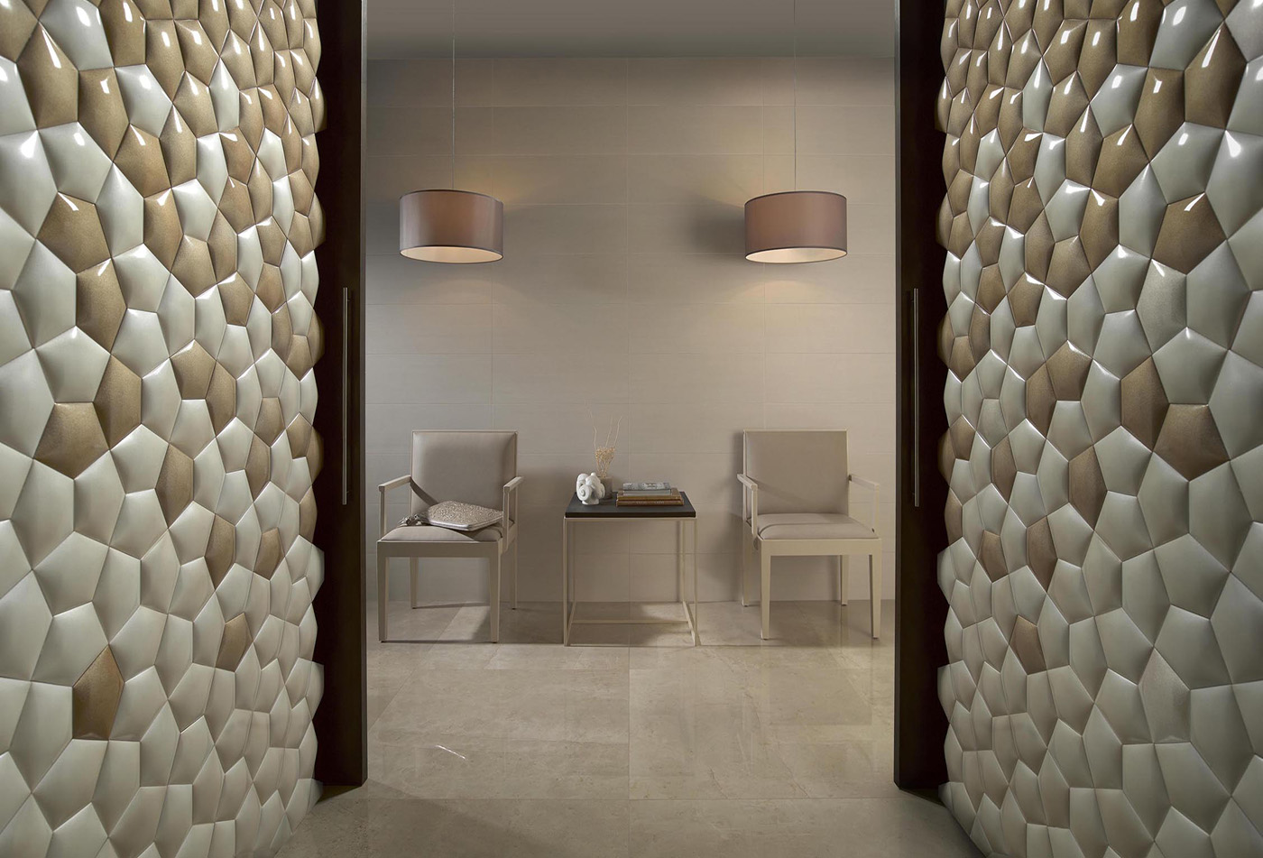 KIN is a ceramic wall covering designed by DSIGNIO to Harmony-Peronda that takes its inspiration from the mathematics patterns in nature. No form is accidental, no details are left to chance. Thousands of small molecules build stunning pieces of engineering: a great architecture that is perpetuated over time.
